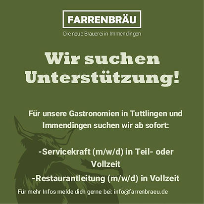 Willkommen im neuen Farrenstüble in Immendingen – direkt im Brauereigebäude! Als junges Unternehmen mit Leidenschaft für gutes Bier und gesellige Momente freuen wir uns, euch in unserer frisch eröffneten Biergaststätte zu begrüßen.